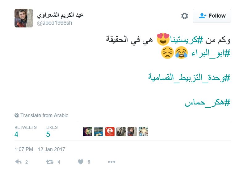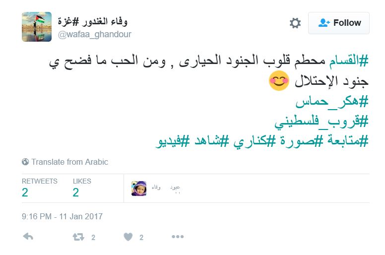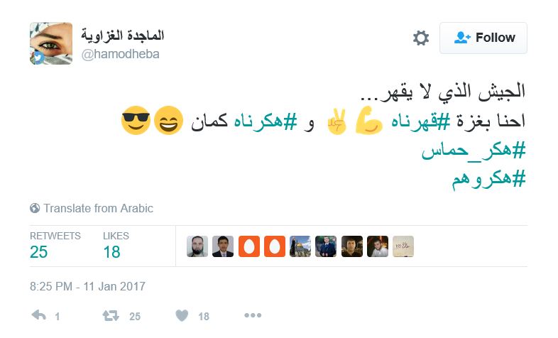 ودشن رواد مواقع التواصل هاشتاج باسم “هكر حماس”، عبروا فيه عن دعمهم وإعجابهم بأفكار القسام في محاربة العدو، ساخرين من الجنود اليهود الذين أسرعوا بالافصاح عن المعلومات لفتيات تعرفوا عليهن من خلال صفحات الفيس بوك.