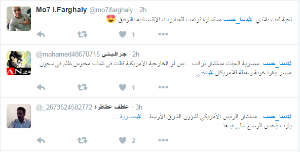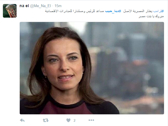 تصدرت المصرية دينا حبيب، موقع تويتر، عقب إعلان اختيارها مستشارة للرئيس الأميركي دونالد ترامب، للمبادرات الاقتصادية.