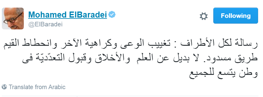 وكتب “البرادعي” في تغريدة عبر حسابه على موقع التدوين المصغر “تويتر”: “رسالة لكل الأطراف.. تغييب الوعي وكراهية الآخر وانحطاط القيم طريق مسدود، لا بديل عن العلم والأخلاق وقبول التعدّديّة في وطن يتسع للجميع”.