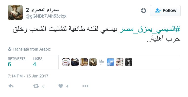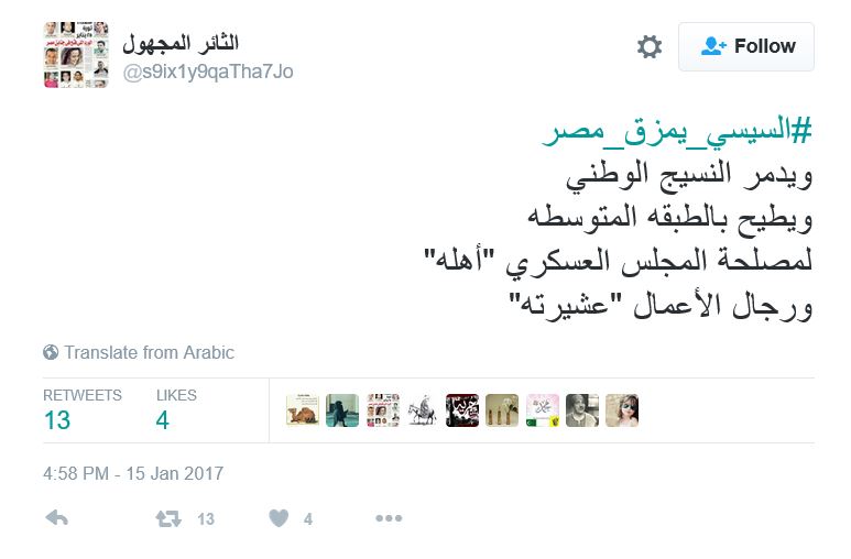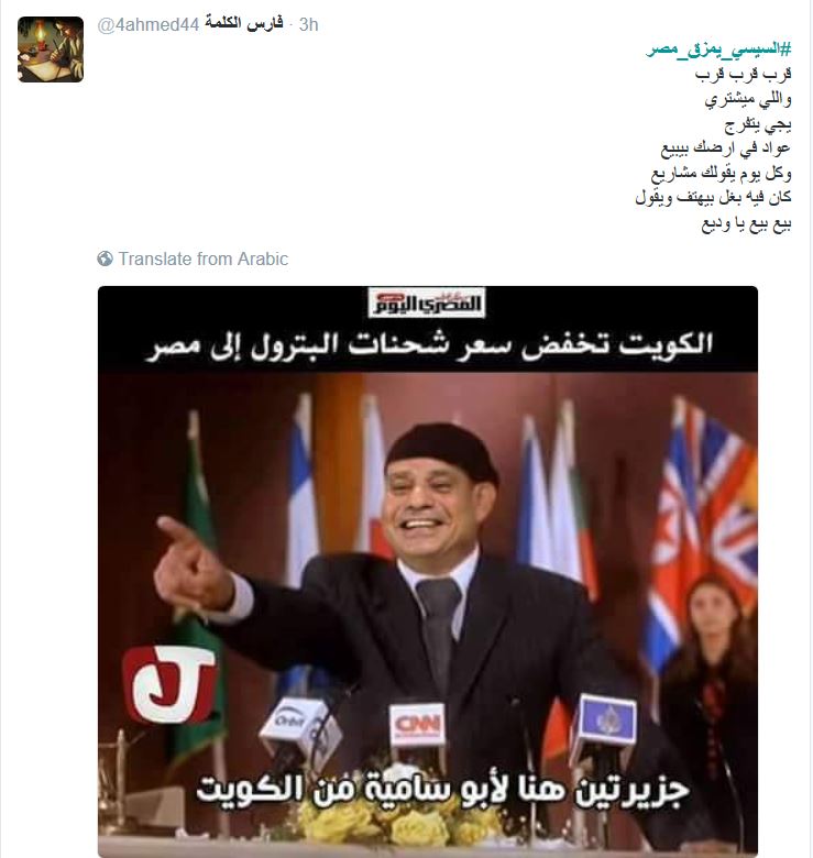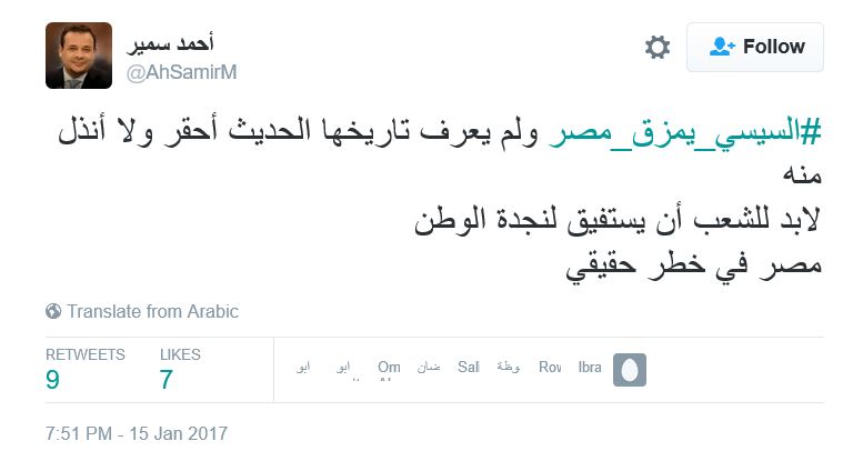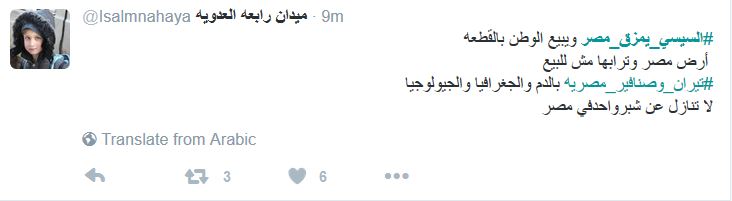 ودشن رواد مواقع التواصل الاجتماعي ، هاشتاج “السيسي_يمزق_مصر”، ليحتل صدارة الأوسمة الأكثر انتشارًا على موقع التدوينات الصغيرة “تويتر”.