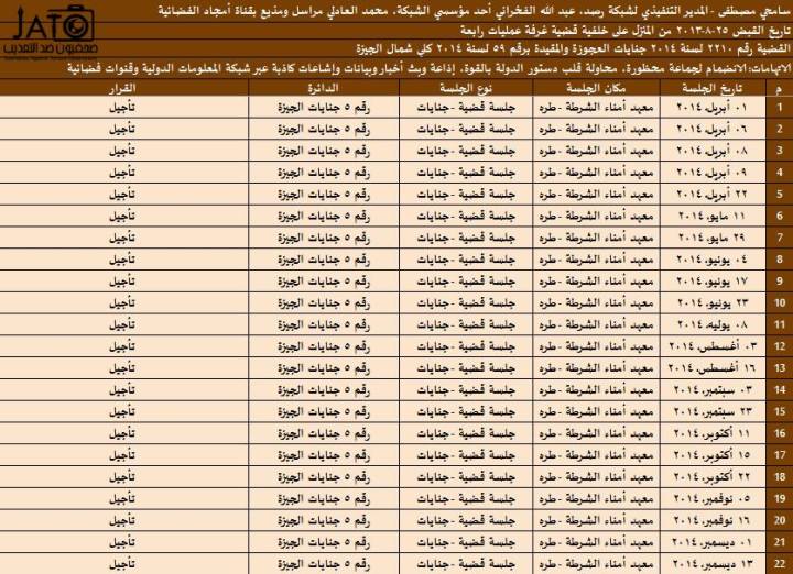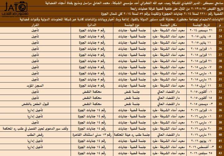 وفي أبريل 2014 قضت المحكمة العسكرية، ببراءة عمرو سلامة القزاز، أحد مؤسسي الشبكة، وقضت بالسجن ما بين سنة و3 سنوات لأربعة متهمين آخرين هم إسلام الحمصي، مدير قسم التواصل الاجتماعي بالشبكة، وعمرو فراج، مدير العلاقات العامة، وعمر شاهين، المسؤول التقني بالشبكة، ومحمد عبدالمنعم، بتهمة “نشر أسرار عسكرية” على خلفية نشر الشبكة تسريبات ومقتطفات للسيسي.