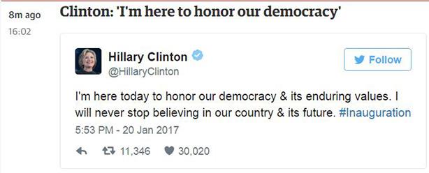 قالت كلينتون، عبر حسابها على موقع “تويتر”: “إن هذا اليوم هو يوم مشرف للديمقراطية الأمريكية”، مشيرة إلى أنها تحضر حفل تنصيب ترامب لإيمانها بمستقبل أفضل لبلادها.