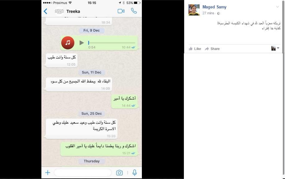 ووضع “سامي”، عبر حسابه الشخصي على موقع التواصل الاجتماعي “فيس بوك”، محادثة كانت بينه وبين اللاعب محمد تريكة، عبر تطبيق “واتس آب” الشهير، أرسل فيها أبو تريكة تعازيه في متوفي الكنيسة البطرسية، في ديسمبر الماضي.