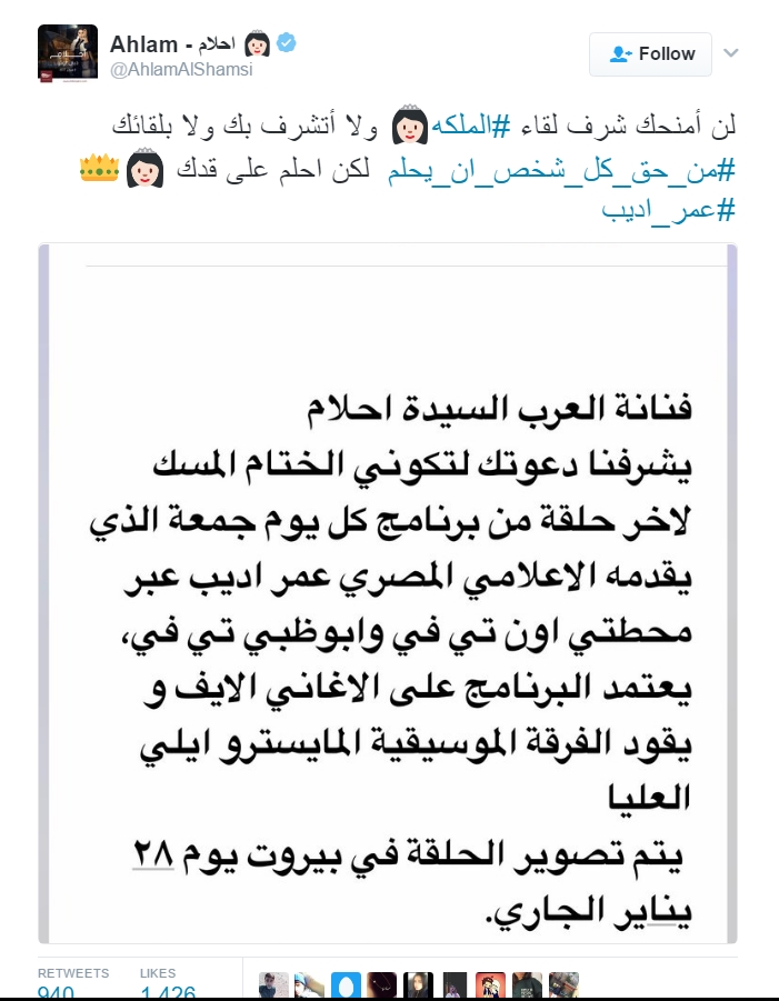 وقالت الفنانة أحلام عبر صفحتها الشخصية على “تويتر”، بعد أن نشرت صورة من الدعوة الموجهة إليها: “لن أمنحك شرف لقاء #الملكه ولا أتشرف بك ولا بلقائك #من_حق_كل_شخص_ان_يحلم لكن احلم على قدك “.