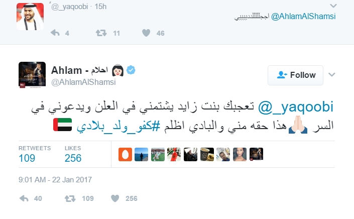 وتابعت : تعجبك بنت زايد يشتمني في العلن ويدعوني في السر ،هذا حقه مني والبادي اظلم”.