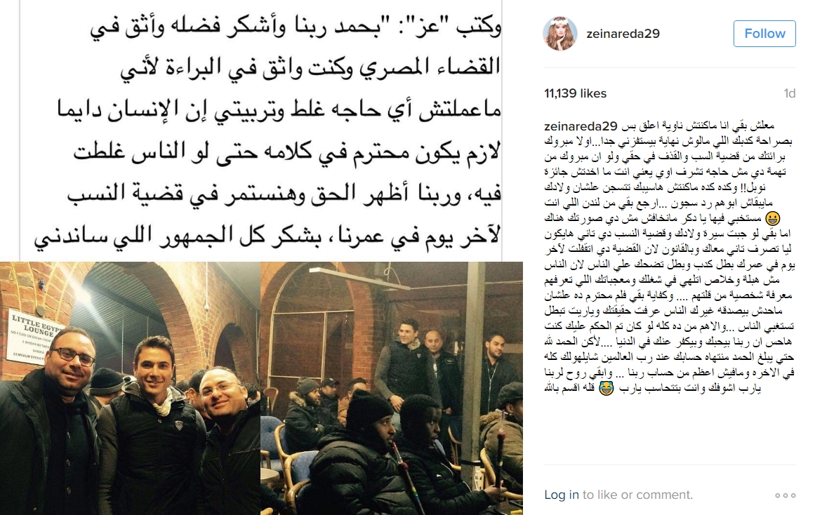 وكتبت زينة عبر صفحتها الشخصية على موقع إنستجرام” معلش بقي انا ماكنتش ناوية اعلق بس بصراحة كدبك اللي مالوش نهاية بيستفزني جدا…اولا مبروك براءتك من قضية السب والقذف في حقي ولو ان مبروك من تهمة دي مش حاجه تشرف اوي يعني انت ما اخدتش جائزة نوبل!! وكده كده ماكنتش هاسيبك تتسجن علشان ولادك مايبقاش ابوهم رد سجون”.
