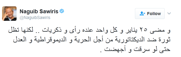 قال عبر حسابه عبر موقع التدوينات المصغر “تويتر”: “ومضى ٢٥ يناير وكل واحد عنده رأى وذكريات.. لكنها تظل ثورة ضد الديكتاتورية من أجل الحرية والديموقراطية والعدل حتى لو سرقت وأجهضت.”