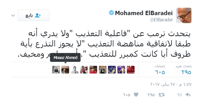 كتب البرادعي عبر حسابه على “تويتر”: “يتحدث ترامب عن (فاعلية التعذيب) ولا يدري أنه طبقا لاتفاقية مناهضة التعذيب (لا يجوز التذرع بأية ظروف أيا كانت كمبرر للتعذيب).. أمر صادم ومخيف”.