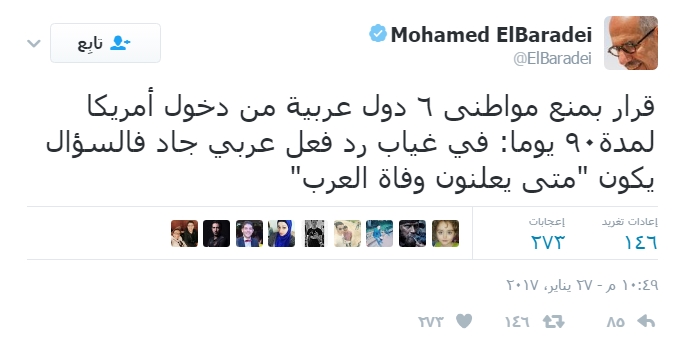 وجه الدكتور محمد البرادعي، المدير الأسبق لوكالة الطاقة الذرية انتقادات، للرئيس الاميركي الجديد، بعد حديثه عن فاعلية التعذيب، وقراره بمنع مواطني 6 دول اسلامية من دخول أميركا، متسائلا عن رد فعل العرب تجاه القرار.