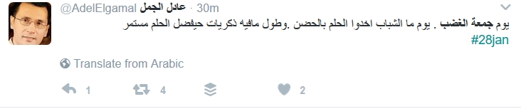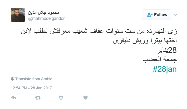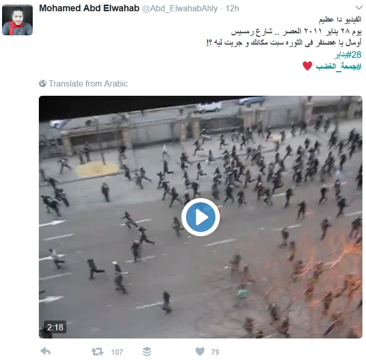 دشن عدد من النشطاء عبر "تويتر"، عدد من الأوسمة بمناسبة الذكرى السادسة لـ" جمعة الغضب"، منها:" 28 يناير" .. "#28jan".. "جمعه الغضب".