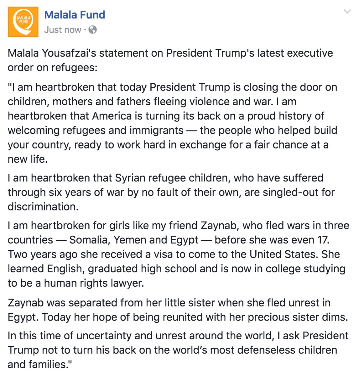 واضافت “يوسفزاي” في بيان لها نشرته صفحة “صندوق ملالا” الخاصة بتعليم الاطفال: ” أشعر بحسرة لأن أمريكا تدير ظهرها للأطفال والأمهات والآباء الذين يفرون من العنف والحرب، ومستعدون للمشاركة في بناء بلادكم مقابل الحصول على فرصة عادلة في الحياة.. أنا حزينة من أجل الاطفال السوريين، الذين عانوا خلال ست سنوات من الحرب لا ذنب لهم ارتكبوه، حتى يتم التمييز ضدهم بهذا الشكل”.