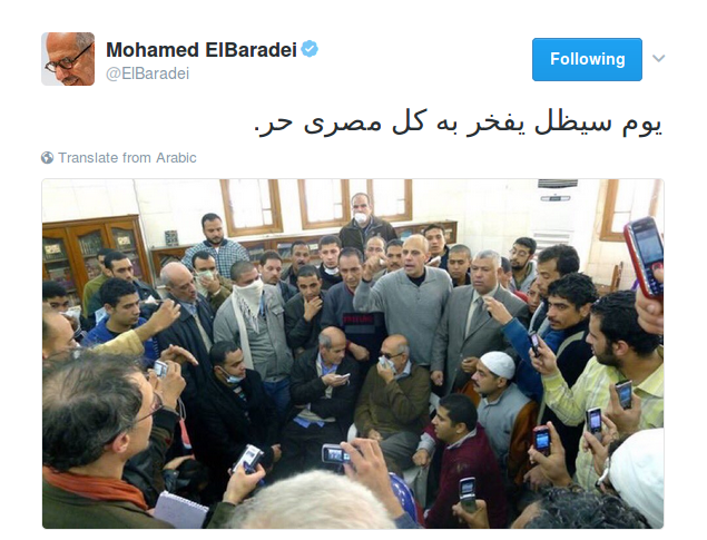 ونشر “البرادعي” صورة له وسط المتظاهرين يومها، عبر حسابه الشخصي على موقع “تويتر”، وعلّق عليها قائلًا: “يوم سيظل يفخر به كل مصري حر”.