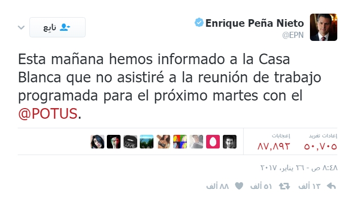ورد الرئيس المكسيكي عبر “تويتر”: “أبلغت البيت الأبيض هذا الصباح أنني لن أحضر اجتماع العمل المقرر الثلاثاء”.
