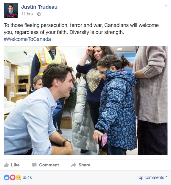 وقال جاستين ترودو في منشور له على صفحته الرسمية: “إلى أولئك الذين يعانون من الاضطهاد والحرب والإرهاب.. الكنديون يرحبون بكم، بغض النظر عن عقيدتكم فالتنوع هو مصدر قوتنا.. أهلا بكم في كندا”.