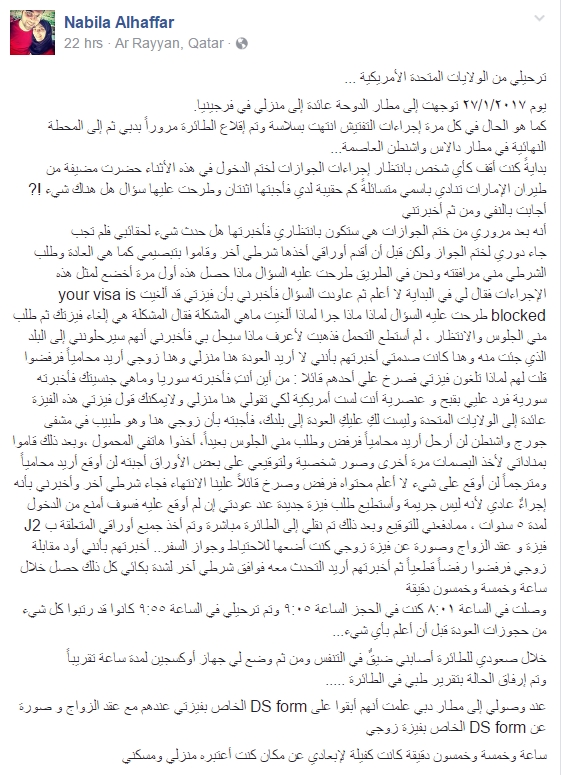 وتابعت “الحفار”:”أجبته بأن زوجي هنا وهو طبيب في مشفى جورج واشنطن لن أرحل أريد محامياً فرفض وطلب مني الجلوس بعيداً، أخذوا هاتفي المحمول ،وبعد ذلك قاموا بمناداتي لأخذ البصمات مرة أخرى وصور شخصية ولتوقيعي على بعض الأوراق أجبته لن أوقع أريد محامياً ومترجماً لن أوقع على شيء لا أعلم محتواه فرفض وصرخ قائلاً علينا الانتهاء فجاء شرطي آخر وأخبرني بأنه إجراءٌ عادي لأنه ليس جريمة وأستطيع طلب فيزة جديدة عند عودتي إن لم أوقع عليه فسوف أمنع من الدخول لمدة ٥ سنوات”.