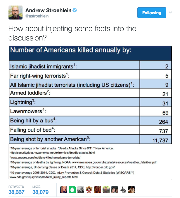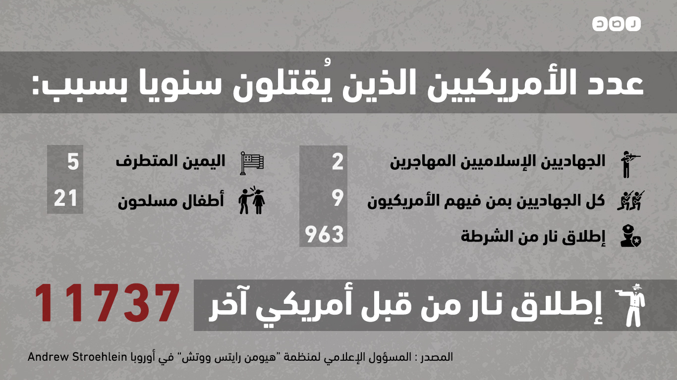 كشفت إحصائية أعدتها منظمة “هيومن رايتس ووتش” عن تعرض 11737 أميركي لإطلاق نار من أميركي أخر سنويًا، ومقتل 963 من أخرين على يد الشرطة في جميع الولايات، بينما قتل 9 على يد كل الجهاديين بمن فيهم الأميركيين، وقتل 21 على يد أطفال مسلحين، و 5 برصاص اليمين المتطرف، وإثنان على يد الجهاديين الإسلاميين، ما يكشف أن قتلى الشرطة الأميركية أكثر من 10 أضعاف قتلاهم جراء الجهاديين.