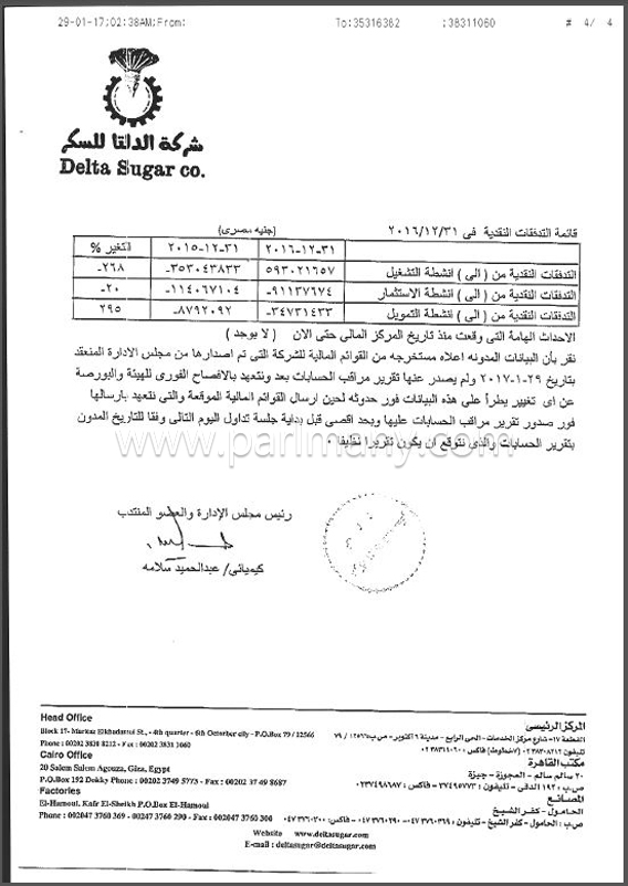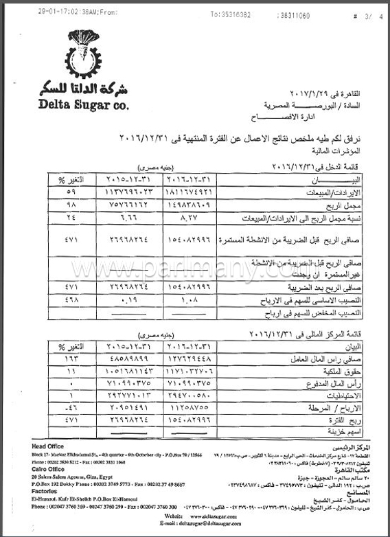 كشفت القوائم المالية للبورصة المصرية عن أن شركة الدلتا للسكر التابعة للشركة القابضة للصناعات الغذائية، تربحت خلال عام 2016م، 154 مليون جنيه بنسبة 471%، وبزيادة 128 مليون جنيه عن العام المالى السابق 2015 وجاءت هذه الزيادة نتيجة ارتافع نسبة المبيعات بواقع 59%.