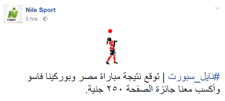 وجاء في منشور عبر الصفحة: “توقع نتيجة مباراة مصر وبوركينا فاسو واكسب معنا جائزة الصفحة ٢٥٠ جنيه”.