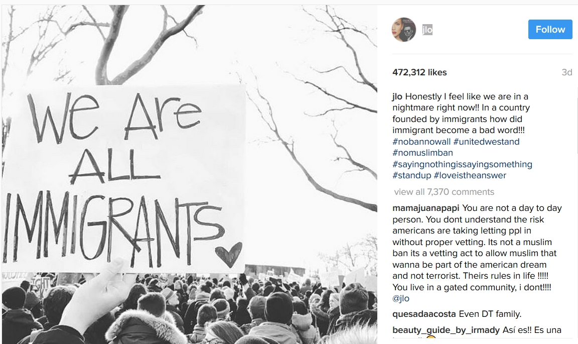 هاجمت النجمة الأميركية جنيفر لوبيز قرار الرئيس الأميركي دونالد ترامب الذي حظر فيه دخول مواطني 7 دول إسلامية إلى الولايات المتحدة الأميركية.