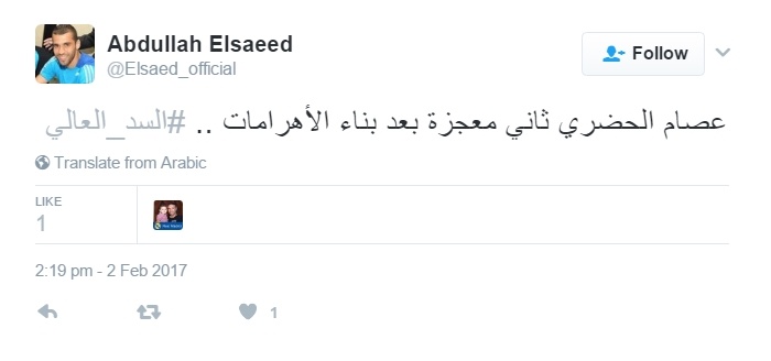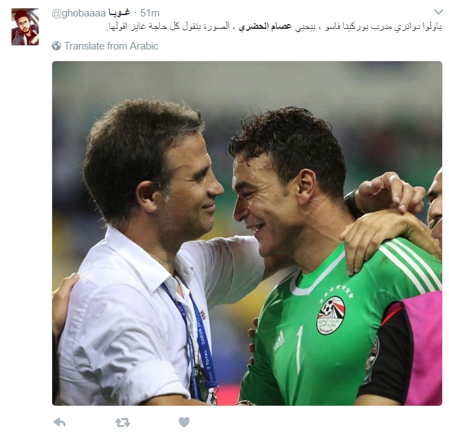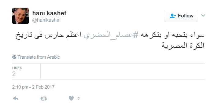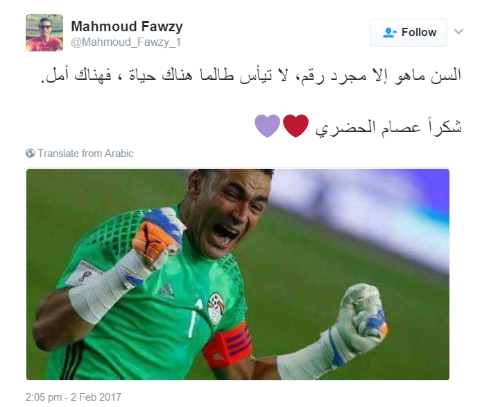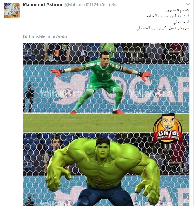 ودشن مغردون على موقع التدوينات الصغيرة “تويتر” هاشتاج باسم “عصام الحضري”، للتعبير عن امتنانهم لاداءه العالي بالرغم من بلوغه سن الـ 44 عامًا، وفضله في تأهل المنتخب رغم الاداء الضعيف للفريق خلال المباراة.