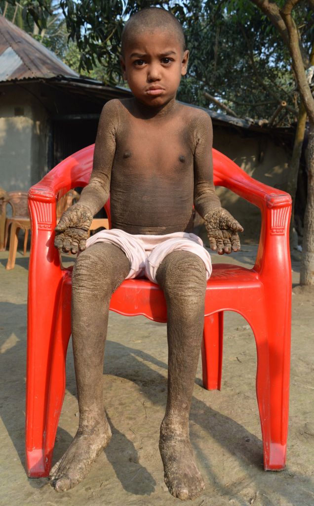 أصيب طفل من بنجلاديش، عمره 8 سنوات بمرض نادر، يجعله جلده يظهر كالمتحجر، حيث يغطي جسم الطفل طبقات سميكة من القشور أو الحراشف التي بمجرد لمسها تسبب له الألم.