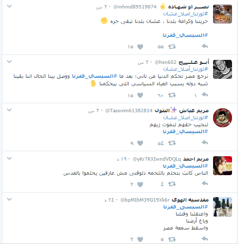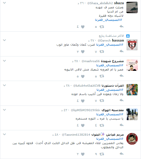 وأطلق مغردو “تويتر” هاشتاجًا تحت عنوان “#السيسي_فقرنا”، تصدر قائمة “الأكثر تداولًا” في مصر بعد ساعات من تدشينه.
