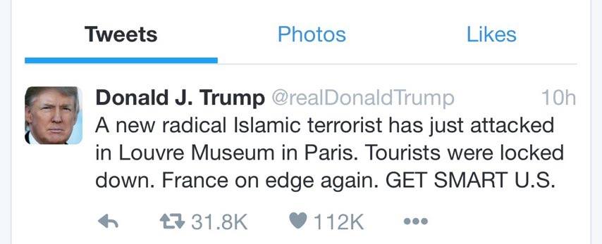 علق الرئيس الأمريكي دونالد ترمب على الهجوم الذي وقع الجمعة على جنود فرنسيين أمام متحف اللوفر فور وقوعه وقبل الإعلان عن هوية المنفذ، فقال في موقع تويتر: “إرهابي إسلامي متطرف جديد هاجم للتو متحف اللوفر في باريس. السياح تمت محاصرتهم. فرنسا على الحافة مجددًا. كوني ذكية يا أمريكا”.