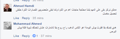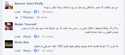 وجاءت تعليقات الرواد على المنشور منتقدة اتصال السيسي باللاعبين قبل المباراة، متشائمين من تدخله في الرياضة؛ خاصة هذه المباراة، مؤكدين أن الإعلام كان سينسب الفوز إلى السيسي.