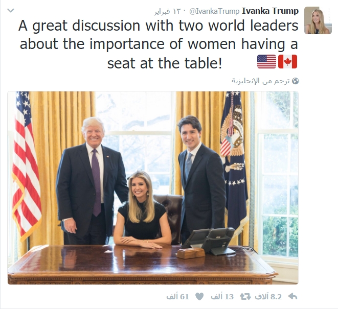 نشرت إيفانكا ترامب ابنة الرئيس الأميركي دونالد ترامب، صورة على حسابها على “تويتر”، جلست فيها على المكتب البيضاوي، وخلفها والدها، ورئيس الوزراء الكندي.
