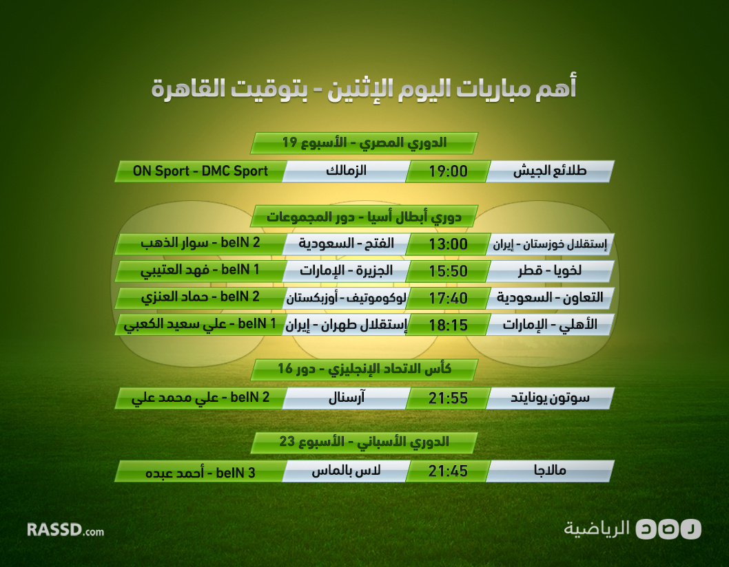 وتخوض عدة فرق مباريات في دور المجموعات من دوري أبطال آسيا، ومباراة في الدوري الإسباني، كما هو موضح في الجدول الآتي بتوقيت القاهرة: