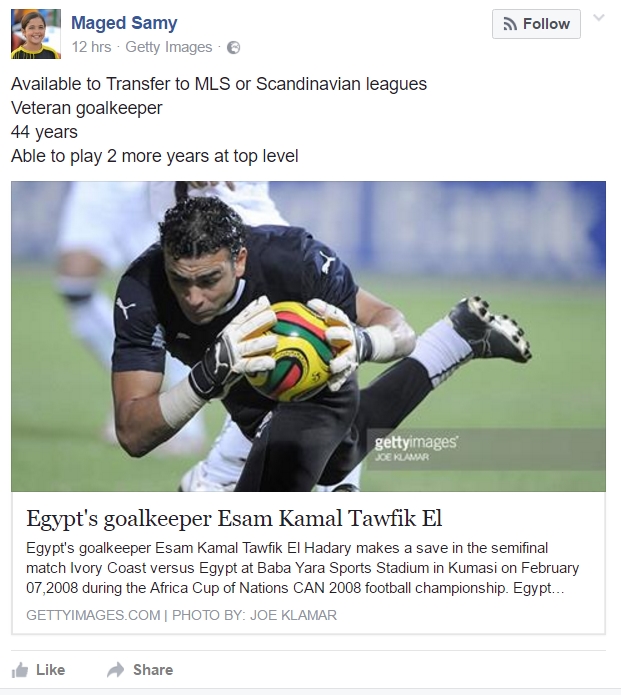 وفوجئ رواد مواقع التواصل، بنشر “سامي” منشور على حسابه الشخصي، يعرض فيه الحضري للبيع ” لاعب متاح للبيع للدوري الأمريكي لكرة القدم أو الدوريات الإسكندنافية…حارس مخضرم، عمره 44 عاما، يمكنه أن يلعب عامين أو أكثر بمستوى مرتفع”.