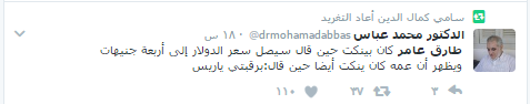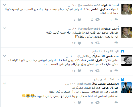 أثار تصريح لمحافظ البنك المركزي طارق عامر، بأن سعر الدولار سيصل إلى أربعة جنيهات، سخرية رواد مواقع التواصل الاجتماعي، حيث أكد إنه كان يمزح حين صرح مسبقاً .