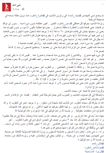 وقالت “منى إمام” في منشور لها عبر موقع التواصل الاجتماعي “فيس بوك”: “تم وضع ابني المهندس جهاد الحداد في زنازين التأديب في مقبرة العقرب منذ نزول مقالة باسمه في صحيفة أميركية”.