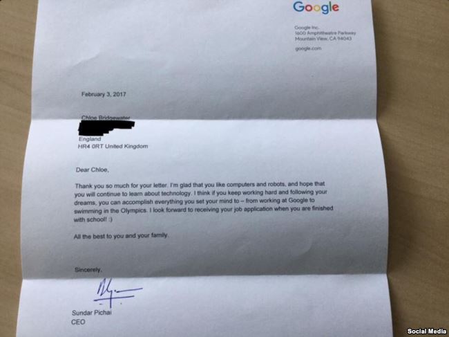 ولم يتوقع والد كلوي أن يصل ابنته، رد من مدير شركة جوجل سوندار بيشاي يشكرها على اهتمامها بالتكنولوجيا والروبوتات.