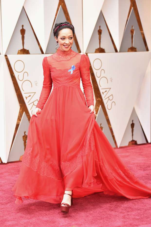 وفي أول تدخل سياسي، وضع عدد من الحضور شارات زرقاء على ملابسهم، عند دخولهم للقاعة من بينهم النجمة روث نيجا.