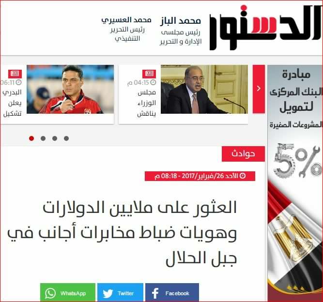 وقال النائب علاء عابد، رئيس لجنة حقوق الإنسان بمجلس النواب، إن قوات إنفاذ القانون من رجال الجيش والشرطة المدنية عثرت فى جبل الحلال بشمال سيناء على ملايين الدولارات، وهُويات خاصة لبعض عناصر وضباط مخابرات من بعض الدول الأجنبية المجاورة، موضحًا أن وجود مثل هذه الهويات يؤكد بالدليل القاطع أن أجهزة مخابرات تستخدم هؤلاء الإرهابيين، مضيفًا أن رجال الجيش والشرطة وجدوا أيضا أجهزة اتصال بالأقمار الصناعية، بحسب صحيفة الدستور.