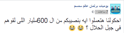 وقالت “Osha Ousha”: 200 مليار قناة السويس و200 مليار المؤتمر الاقتصادي، ودلوقتي ٦٠٠ مليار لقومهم في جبل الحلال وبتقولي إحنا فقرا؟ يالا بقي أعزمني علي سندوتش حواوشي، بس من نوع الحمير الفاخر”. وردت أم منذر البنا: “خلاص دول الخليج ماعادت محتاجة مصريين بينزلوا المصريين الموجودين هناك ارتاحوا ماحد هياخدكم”. وقال أحمد صابر أبوالدهب: “شكرا برلمان عالم سمسم بتدو الحق لاصحابه يارب تبقي رئيس جمهورية أنا فرحان قوى”.