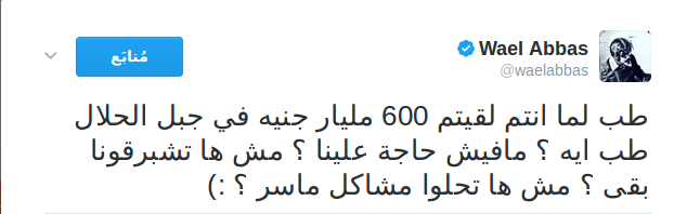 أما الصحفي الليبرالي وائل قنديل، فكتب تغريدتين على حسابه على “تويتر” قال في إحداهما: “لولا تهجير المسيحيين لما عثروا على 600 مليار دولار في جبل الحلال.. بالحق والمستحق أعطوا المهجرين 10% يعني 60 مليار.. الدولة العبيطة تتألق”.