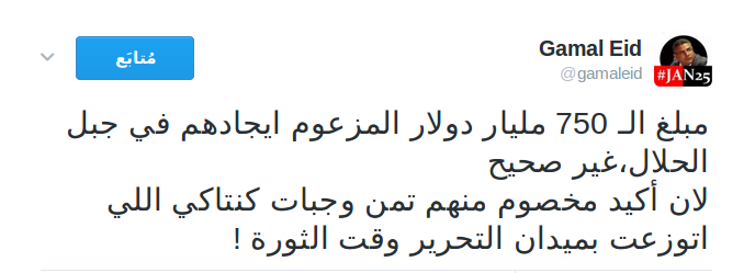 وقال في تغريدة عبر حسابه الشخصي بموقع التغريدات القصيرة “تويتر”: “مبلغ الـ 750 مليار دولار المزعوم ايجادهم في جبل الحلال،غير صحيح، لأن أكيد مخصوم منهم تمن وجبات كنتاكي اللي اتوزعت بميدان التحرير وقت الثورة”.