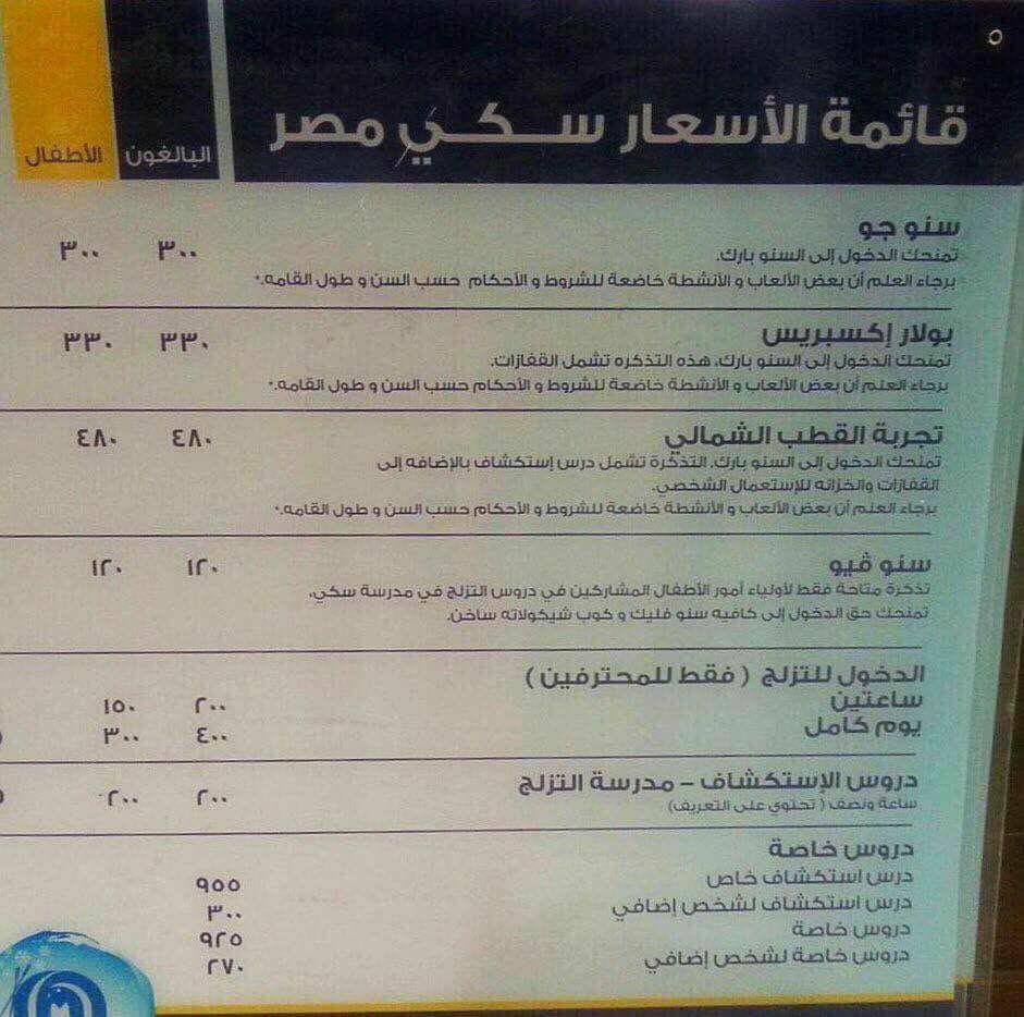 وتتراوح أسعار تذاكر الدخول من 300 جنيه للكبار والأطفال، حتى 955 جنيهًا؛ تشمل دروس تعليم التزلج.