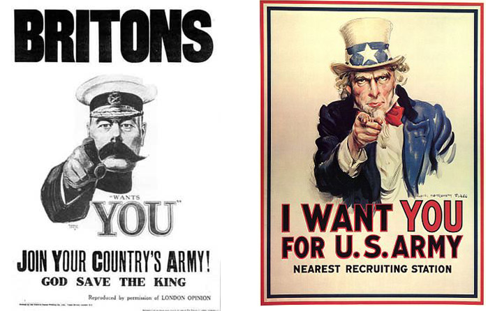 خلال الحرب العالمية الأولى تم رسم ملصق جديد للعم سام، ولكنه يشير أصبعه إلى الناظر إليه، حيث استوحاه الرسام من ملصق بريطاني يدعو إلى التجنيد في الجيش، ويرفق معه تعليق يقول ‘I WANT YOU FOR U.S. ARMY. أي أريدك في الجيش الأمريكي.