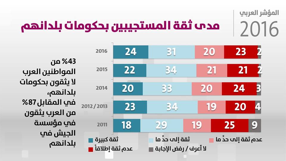 أعلن المركز العربي للأبحاث ودراسة السياسات في الدوحة، في مؤتمر صحفي اليوم الاثنين، عن نتائج استطلاع المؤشر العربي لعام 2016، وتبين أن 43% من المواطنين العرب لا يثقون بحكومات بلدانهم، وفي المقابل 87% من العرب يثقون في مؤسسة الجيش في بلدانهم.