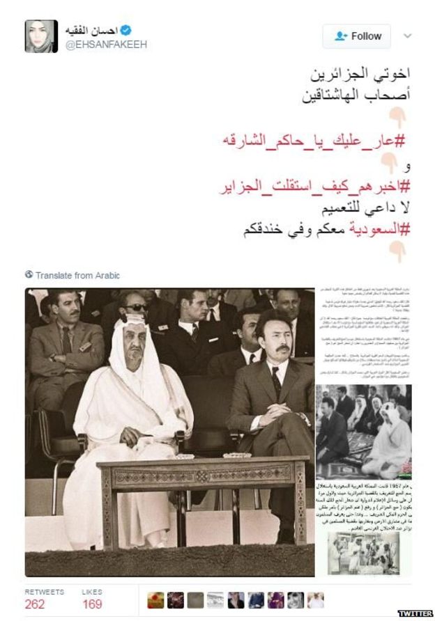 التصريحات التي أدلى بها الحاكم الإمراتي قبل أيام لا تزال تلقى صدى على مواقع التواصل الاجتماعي؛ حيث أطلق المغردون هاشتاجي “#اخبرهم_كيف_استقلت_الجزاير” و”#عار_عليك_يا_حاكم_الشارقة”، وظهرا في حوالي 1860 تغريدة ندد معظمها بتصريحات القاسمي.