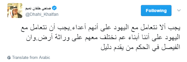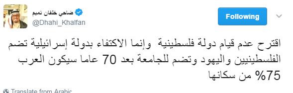 وأثارت عدة تغريدات لضاحي خلفان، رئيس شرطة دبي السابق، جدلًا واسعًا؛ حيث دعا فيها إلى الوحدة بين العرب واليهود وعدم قيام دولة فلسطينية، بل دولة إسرائيلية تضم الجميع.