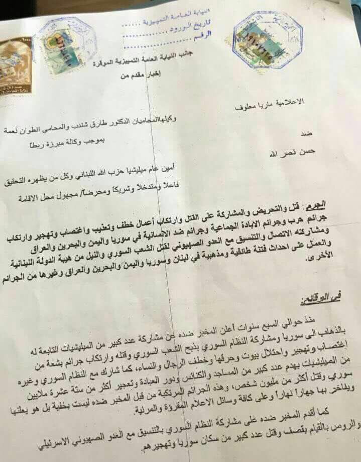 وجاء في نص الدعوى أنه “منذ حوالي سبع سنوات أعلن المخبر ضده ( نصرالله) عن مشاركة عدد كبير من المليشيات التابعة له بالذهاب إلى سوريا ومشاركة النظام السوري بذبح الشعب السوري وقتله وارتكاب جرائم بشعة من اغتصاب وتهجير واحتلال بيوت وحرقها وخطف الرجال والنساء”.