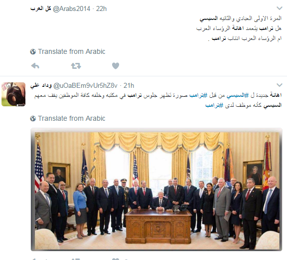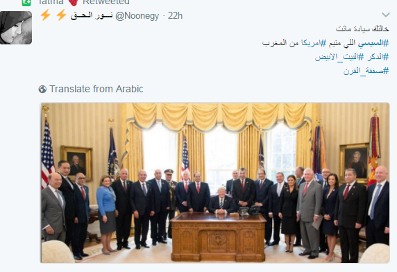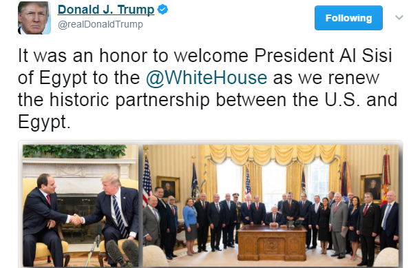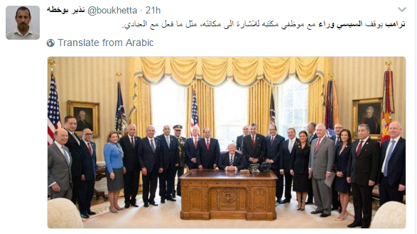 تداول رواد مواقع التواصل الاجتماعي صورة نشرها الرئيس الأميركي دونالد ترامب عبر حسابه بموقع التدوين العالمي “تويتر” من داخل البيت الأبيض، ظهر فيها عبدالفتاح السيسي يقف خلفه مثل باقي الحضور، بينما يجلس ترامب أمامهم؛ الأمر الذي اعتبروه “إهانة لمصر”.
