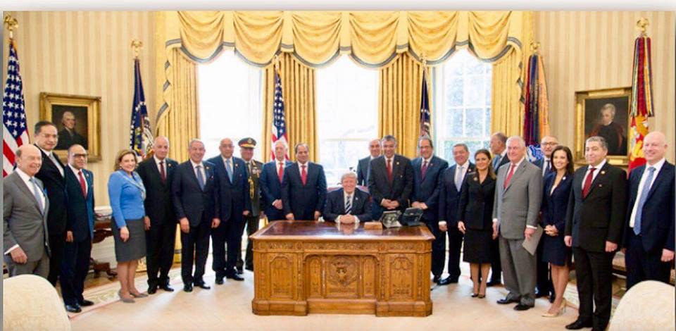 تداول رواد مواقع التواصل الاجتماعي صورة نشرها الرئيس الأميركي دونالد ترامب عبر حسابه بموقع التدوين العالمي “تويتر” من داخل البيت الأبيض، ظهر فيها عبدالفتاح السيسي يقف خلفه مثل باقي الحضور، بينما يجلس ترامب أمامهم؛ الأمر الذي اعتبروه “إهانة لمصر”.