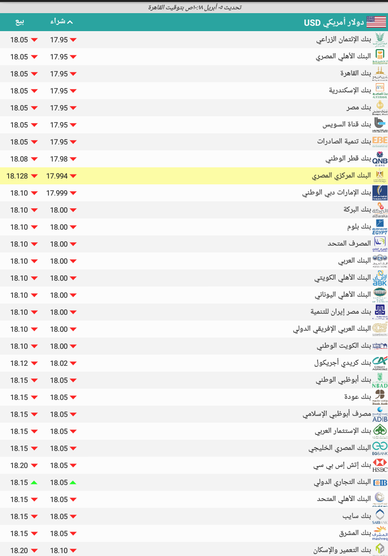 انخفض سعر الدولار اليوم الأربعاء، في البنوك في بداية التعاملات، ليسجل 18.10 جنيه للشراء، و 18.20 جنيه للبيع، بفارق حوالي 5 قروش عن بداية تعاملات أمس.