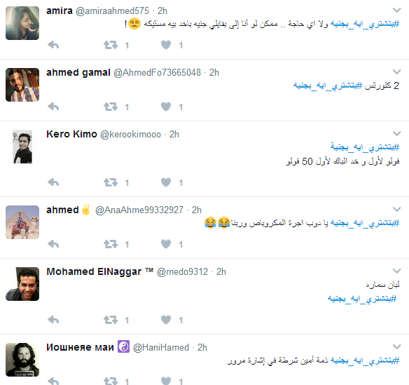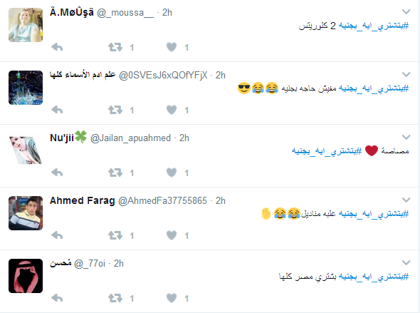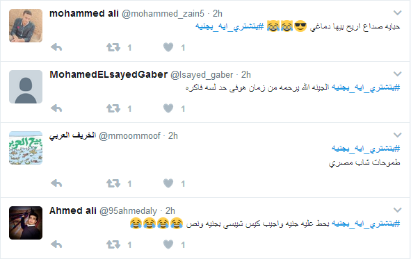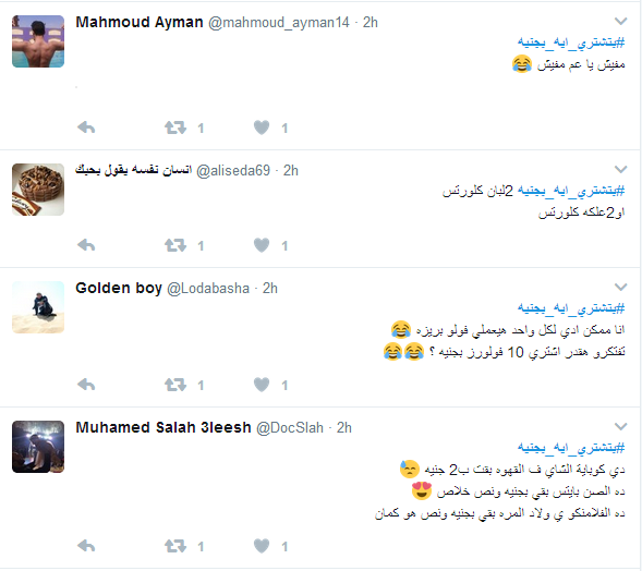 دشن رواد موقع التدوينات المصغر “تويتر” وسم “بتشتري ايه بجنيه”، حيث حقق الوسم صدارة بعد وقت قصير من تدشينه، لليوم الثاني علي التوالي.