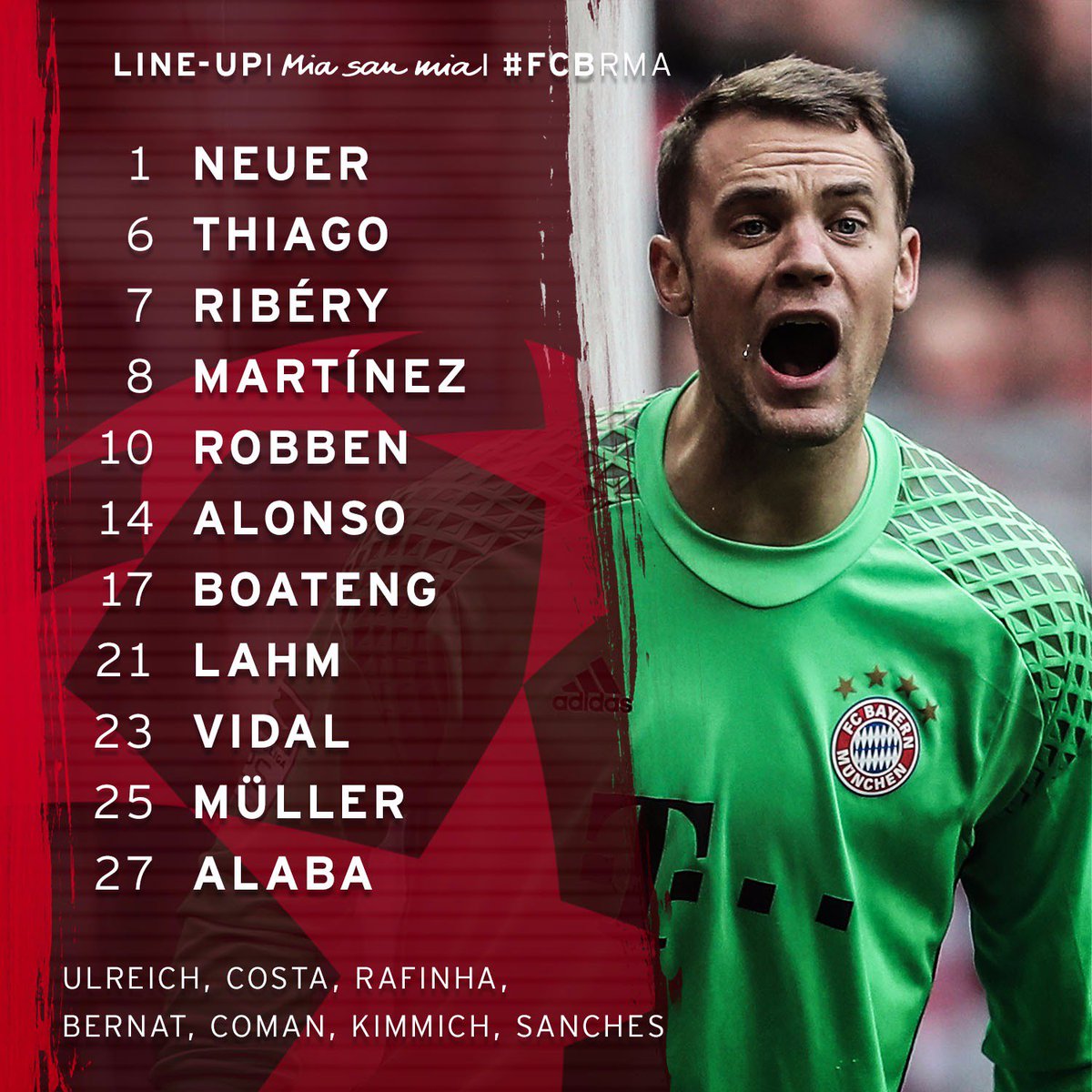 بينما جاء تشكيل بايرن ميونخ، بقيادة مديره الفني كارلو أنشيلوتي، على النحو الآتي: